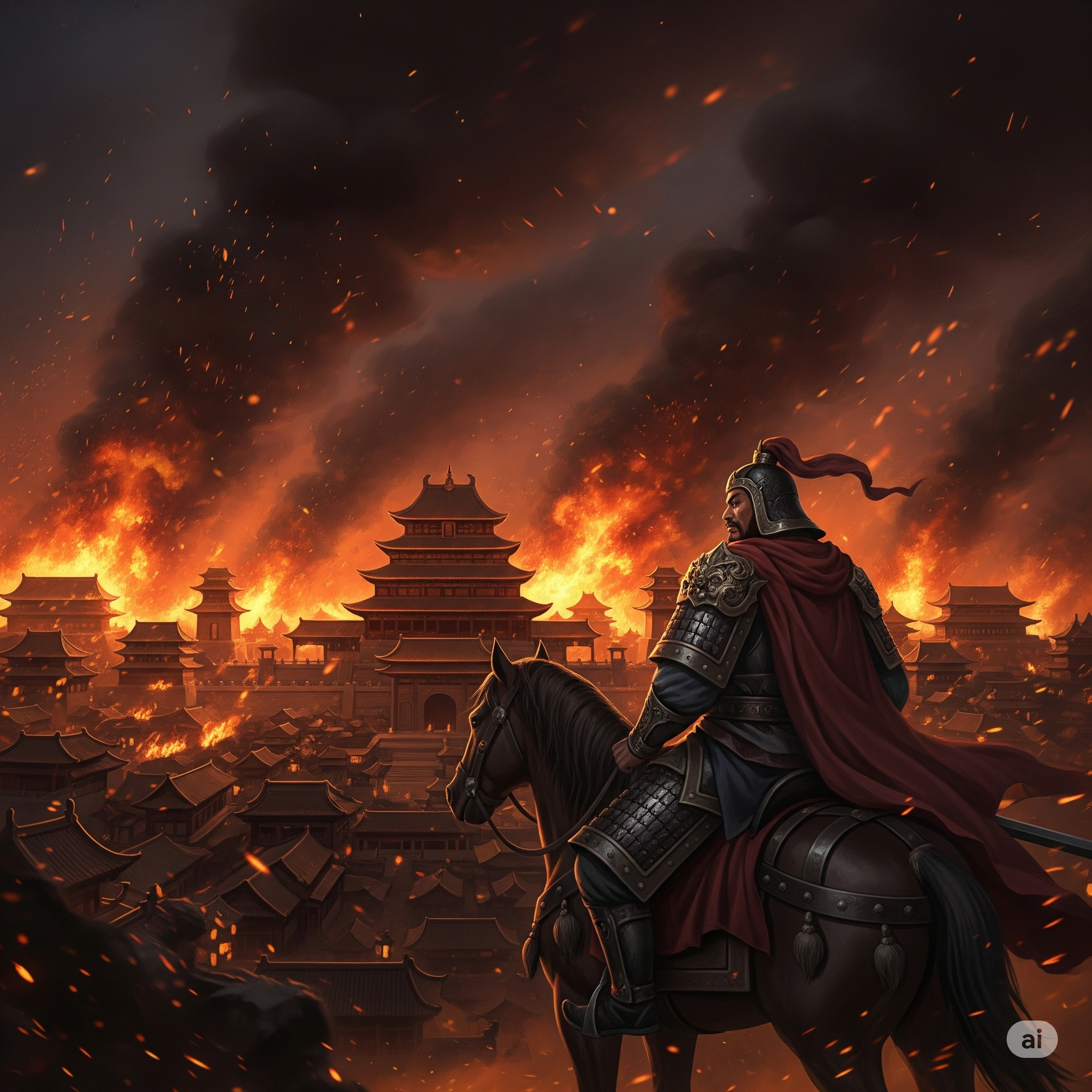 동탁의 명령이 떨어지자, 군사들이 일제히 횃불을 던졌다. 건조한 날씨에 불길은 순식간에 도시 전체로 번져나갔다. 400년 역사를 자랑하던 남궁과 북궁의 화려한 전각들이 거대한 불기둥에 휩싸여 무너져 내렸다. 하늘은 시뻘건 불길과 검은 연기로 뒤덮였고, 그 열기는 수십 리 밖에 진을 치고 있던 연합군의 진영에까지 느껴질 정도였다.