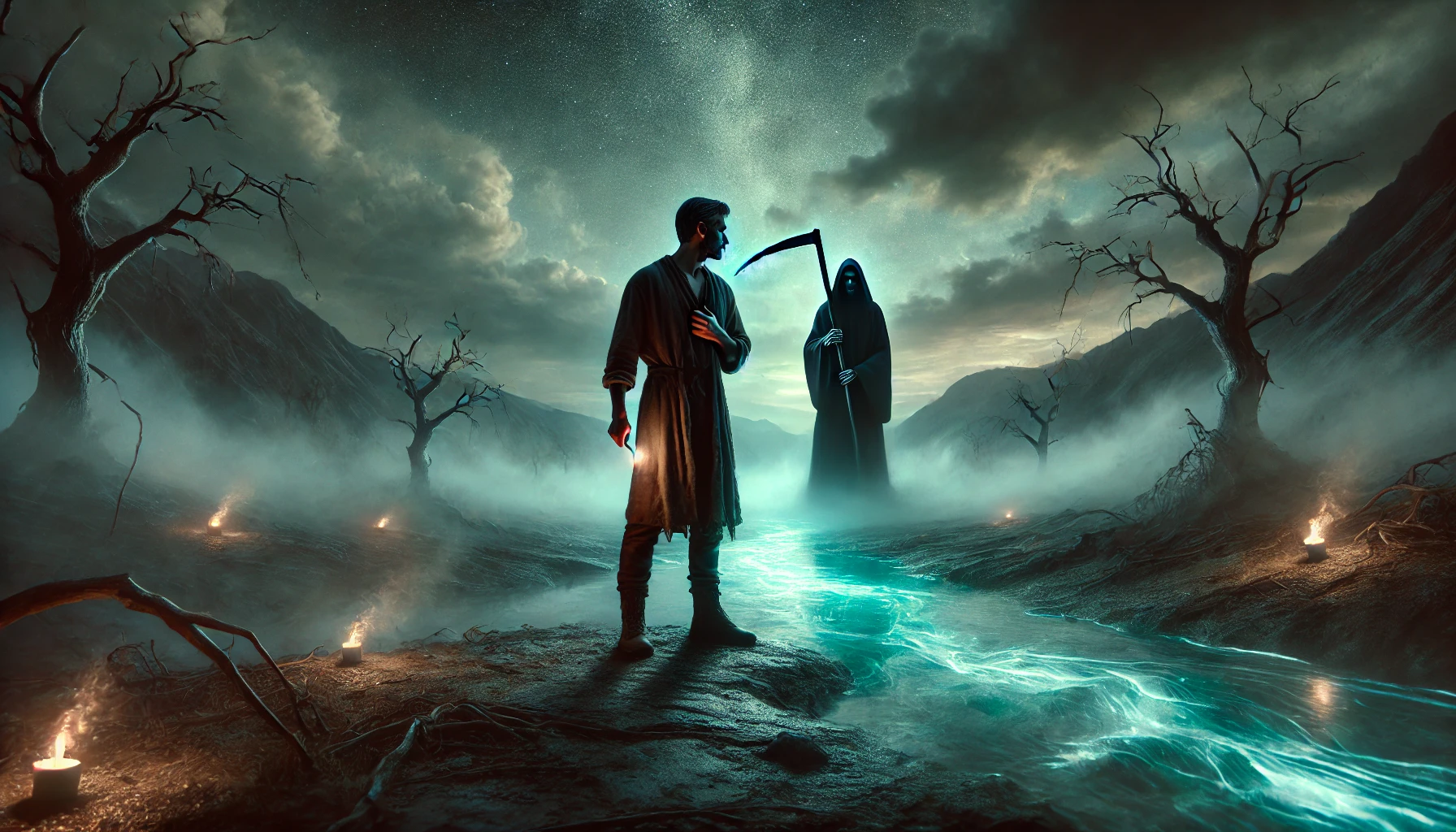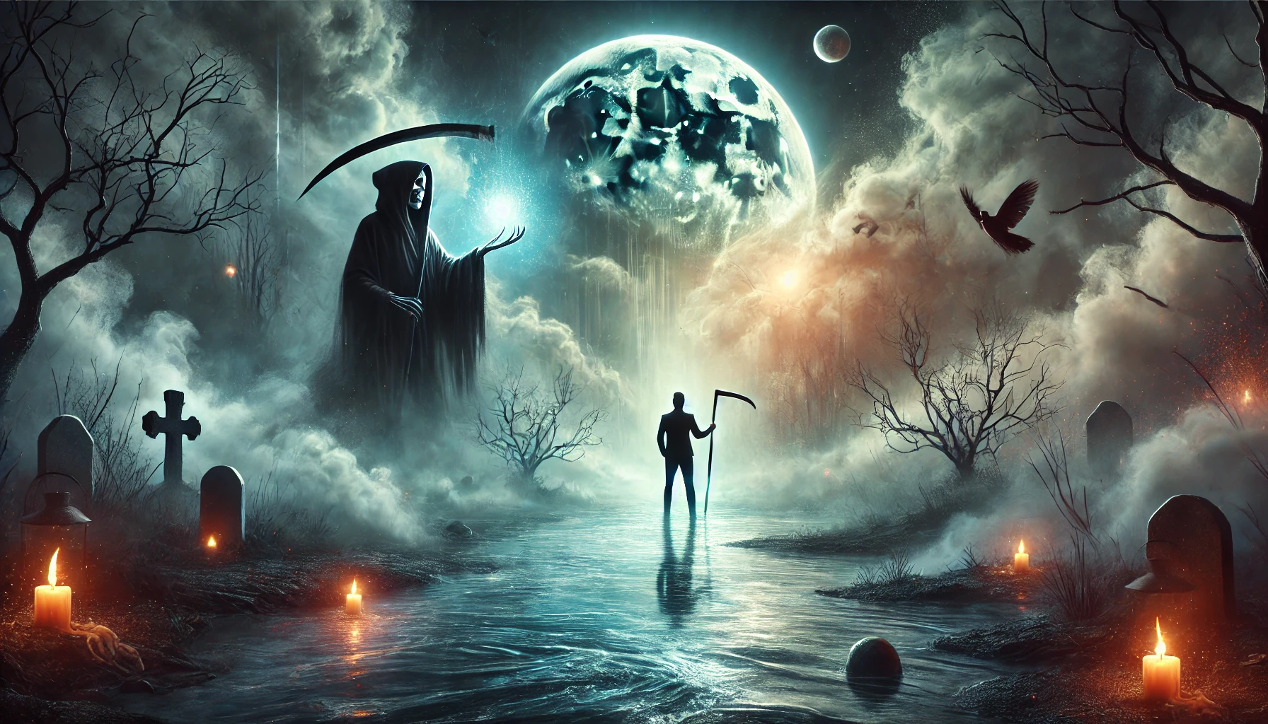 그때, 안개 속에서 검은 그림자가 천천히 모습을 드러냈다. 키가 크고 날카로운 눈빛을 가진 사람이었다. 아니, 사람이라기보다는 그보다 더 초월적인 존재처럼 보였다. 그는 검은 옷을 걸치고 있었고, 손에는 커다란 낫이 들려 있었다.