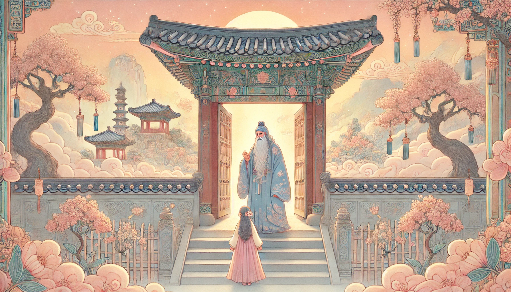 그 정원에는 한 문지기가 있었습니다. 달빛처럼 하얀 머리카락에 구름처럼 푸른 도포를 입은 노인이었지요. 문지기의 유일한 일은 하늘정원의 문을 지키는 것이었습니다. 때로는 구름을 타고 오는 나비들을 맞이하고, 때로는 별빛을 따라 날아오는 새들을 안내했지요.