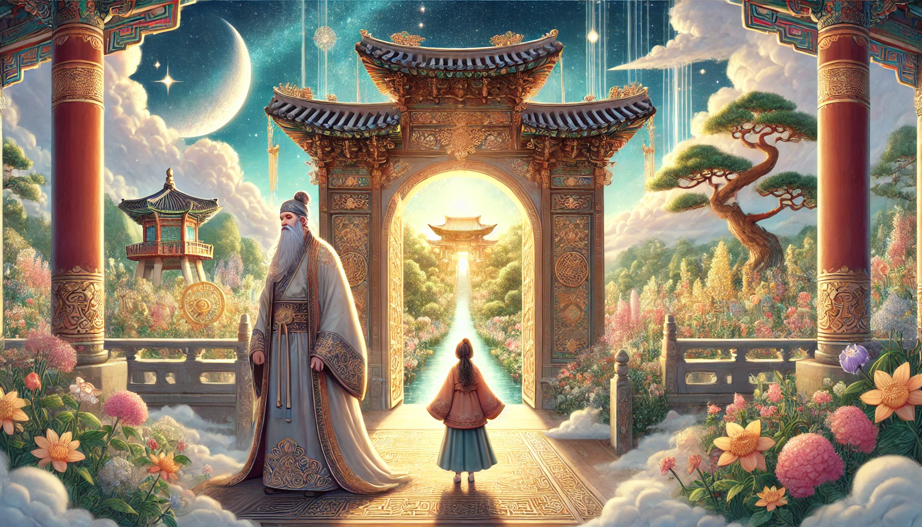 바로 그때였습니다. 멀리서 은은한 풍경소리가 들려왔고, 하늘정원의 문이 달빛을 받아 반짝이기 시작했습니다. 마치 무언가 특별한 일이 일어날 것을 예고하는 것처럼 말이지요.